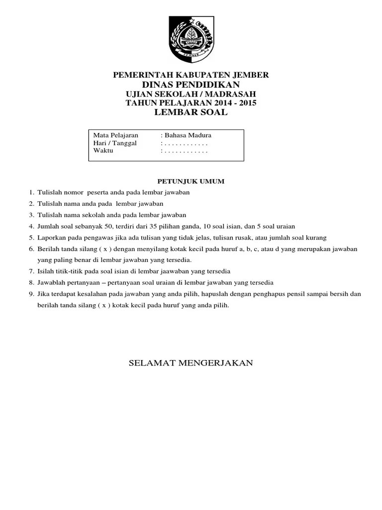 Yang nyari soal soal sd silahkan aja di download soal soal dibawah ini. Indonesia ppkn ips ipa matematika bahasa inggris bahasa madura. Kota sampang terletak di pulau madura. Jawabhan soal uas semester 1 kls 4 b. Berikut bospedia memberikan soal uas bahasa jawa kelas 5 sd/mi.